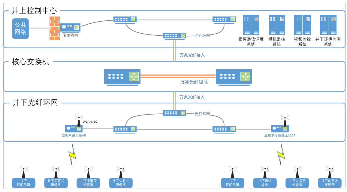 井下光纤冗余环形网,支持 MSTP 与 802.1CB 协议,故障秒级自愈;井上环形网络接入多中心,内外网通过隔离网闸物理隔绝,数据安全有保障。